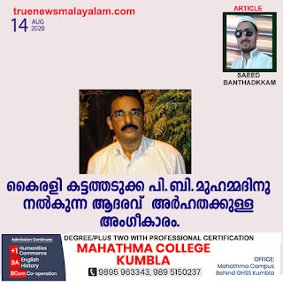 കൈരളി യുടെ സജീവ പ്രവർത്തകനും സുഹൃത്തും ആയ സുൽഫിക്കർ എഫ് ബി യിൽ ടാഗ് ചെയ്ത ഒരു പോസ്റ്റ് ആണ് ഈ കുറിപ്പിന് ആധാരം. പുത്തിഗെ പഞ്ചായത്തിലെ സാമൂഹിക, സാംസ്കാരിക, കലാ,കായിക രംഗത്തെ നിറ സാന്നിധ്യമായ കൈരളി കട്ടത്തടുക്ക ഈ പ്രാവശ്യത്തെ സ്വാതന്ത്ര്യ ദിനാഘോഷ ത്തിൽ പുത്തിഗെ ഗ്രാമപഞ്ചായത്ത് വൈസ് പ്രസിഡന്റ് പി ബി മുഹമ്മദിനെ ആദരിക്കുന്നു. ആദ്യം ആ പോസ്റ്റ് ശ്രദ്ധയിൽ പെട്ടില്ല. പിന്നീടാണ് ശ്രദ്ധിച്ചത്. പിബി മുഹമ്മദ് ജനങ്ങൾക്കിടയിൽ പിബി എന്ന് ചുരക്ക പേരിൽ അറിയപ്പെടുന്ന പുത്തിഗെ യുടെ വൈസ് പ്രസിഡന്റ് എന്ത് കൊണ്ടും ആദരവ് അർഹിക്കുന്ന വ്യക്തി തന്നെയാണ് എന്ന കാര്യത്തിൽ സംശയം ലവലേശം ഇല്ല. പുത്തിഗക്കാരുടെ ആരോഗ്യം,വിദ്യാഭ്യാസം,കൃഷി തുടങ്ങി സാധാരണക്കാരുടെ പ്രശ്നങ്ങളിൽ ഇടപെട്ടു ജനശ്രദ്ധ ആകർഷിച്ച വ്യക്തി ആണ്. രാഷ്ട്രീയ ഭേദമന്യേ എല്ലാവരുടെയും അംഗീകാരം പിബിക്കു ഉണ്ട്. കോവിഡ് കാലമായതിനാൽ വലിയ ജാഗ്രത യാണ് അദ്ദേഹം കാട്ടിയത്. ഹെൽത്ത് ഡിപ്പാർട്ടുമായ് സഹകരിച്ചു ക്വാറന്റൈൻ ഒരുക്കുന്നതിലും ഹെല്പ് ഡസ്ക് പോലെയുള്ള കാര്യത്തിലും കൃത്യമായ ഇടെപെടുകളാണ് പിബി യുടെ ഭാഗത്തു നിന്നുണ്ടായത്. പഞ്ചായത്ത് ന്റെ പദ്ധതികൾ പൊതു ജനങ്ങൾ അറിയുന്നത് ഒരു പക്ഷെ പിബി യിലൂടെ ആയിരിക്കും.ഉന്നത വിദ്യാഭ്യാസം നേടിയ പിബിക്ക് ഇംഗ്ലീഷും നന്നായി വഴങ്ങും എന്നതിന്റെ തെളിവാണ് ദിനേന യുള്ള അദ്ദേഹത്തിന്റെ ഇംഗ്ലീഷ് പത്ര വായന.