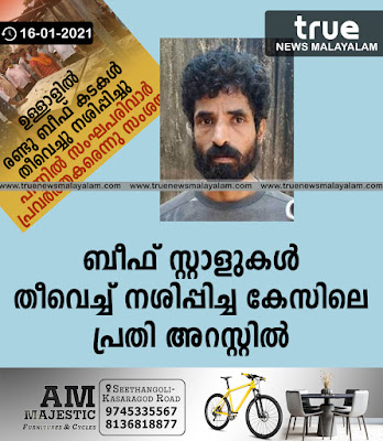 മംഗളൂരു(www.truenewsmalayalam.com 16 JANUARY 2021): ഉള്ളാള് തൊക്കോട്ട് ബീഫ് സ്റ്റാളുകള് തീവെച്ച് നശിപ്പിച്ച കേസിലെ പ്രതിയെ പൊലീസ് അറസ്റ്റ് ചെയ്തു. തൊക്കോട്ട് വലപേട്ടയിലെ വിടോഭ ഭജന മന്ദിരിന് സമീപം താമസിക്കുന്ന നാഗരാജിനെ(39)യാണ് ഉള്ളാള് പൊലീസ് അറസ്റ്റ് ചെയ്തത്. ജനുവരി എട്ടിന് രാത്രിയാണ് ബീഫ് സ്റ്റാളുകള്ക്ക് തീവെച്ചത്. മാംസം വാങ്ങാന് നാഗരാജ് ബീഫ് വില്ക്കുന്ന ഒരു സ്റ്റാളില് പോയിരുന്നു. കൂടുതല് മാംസം ആവശ്യപ്പെട്ടപ്പോള് കടയുടമ നാഗരാജിനെ അപമാനിച്ചു. ഇതില് പ്രകോപിതനായാണ് നാഗരാജ് മൂന്ന് ബീഫ് സ്റ്റാളുകള്ക്ക് തീയിട്ടതെവന്ന് പൊലീസ് പറഞ്ഞു. രാത്രി 11 മണിയോടെ മണ്ണെണ്ണ സംഭരിച്ച് റെയില്വേ സ്റ്റേഷന് സമീപം സൂക്ഷിച്ചിരുന്ന അദ്ദേഹം പുലര്ച്ചെ 1.30 മണിയോടെയാണ് ബീഫ് സ്റ്റാളുകള്ക്ക് തീയിട്ടത്. ഡിസിപിയുടെ മാര്ഗനിര്ദേശപ്രകാരം പ്രതികളെ പിടികൂടാന് മൂന്ന് പ്രത്യേക സംഘങ്ങളെ നിയോഗിച്ചിരുന്നു. സിസിടിവി ദൃശ്യങ്ങളും അനുബന്ധ തെളിവുകളും പൊലീസ് ശേഖരിക്കുകയും ചെയ്തിരുന്നു.
